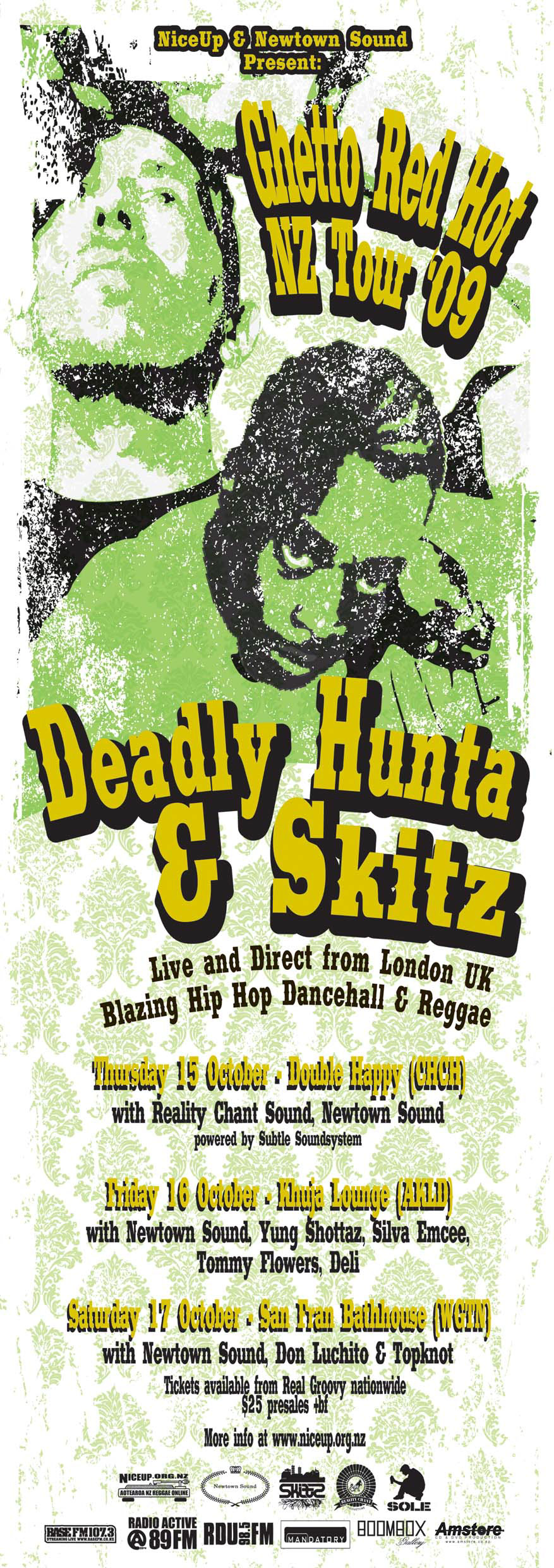 Tour poster designed for NiceUp and their 2009 New Zealand tour of Deadly Hunter (UK) and Skitz (UK).